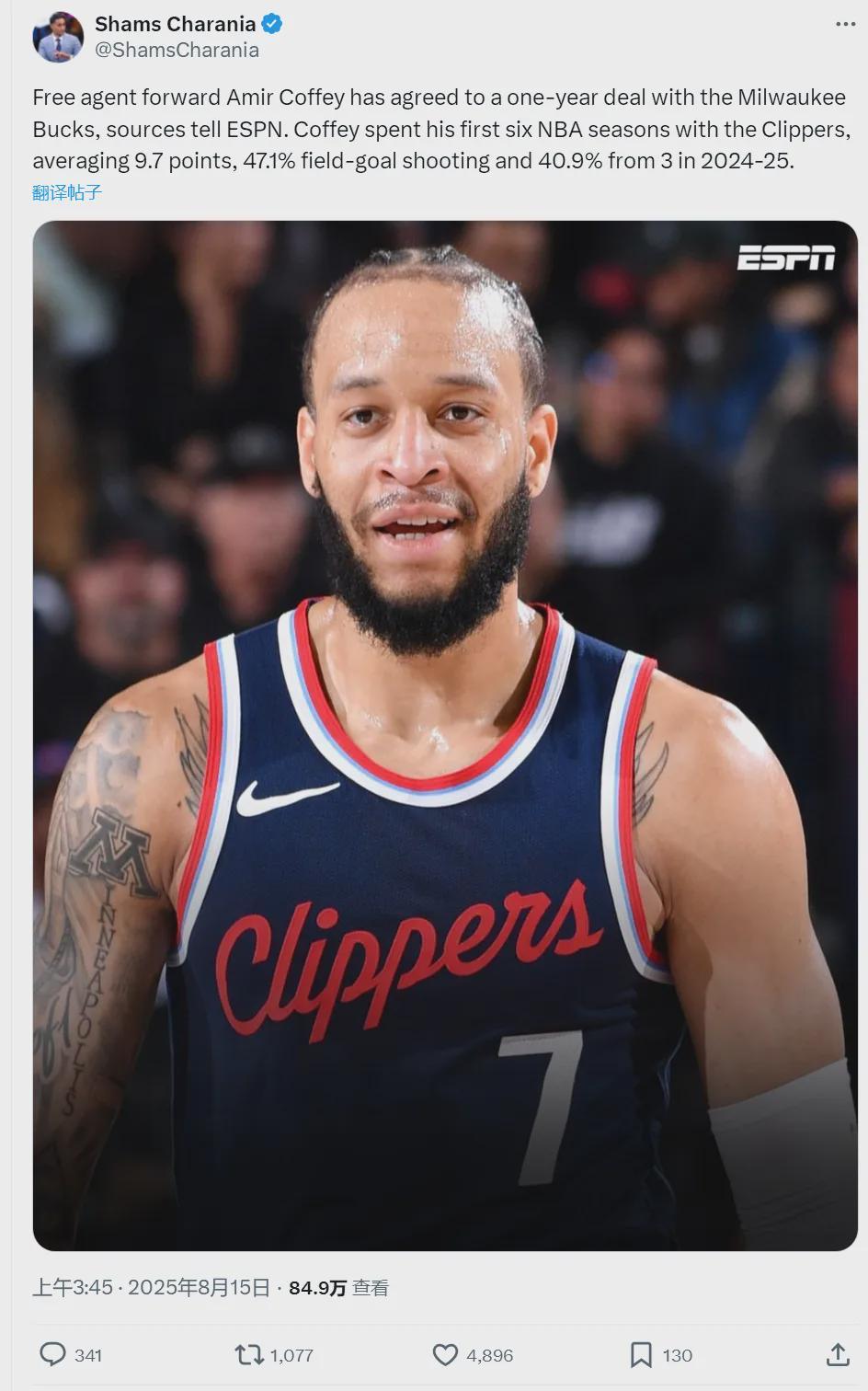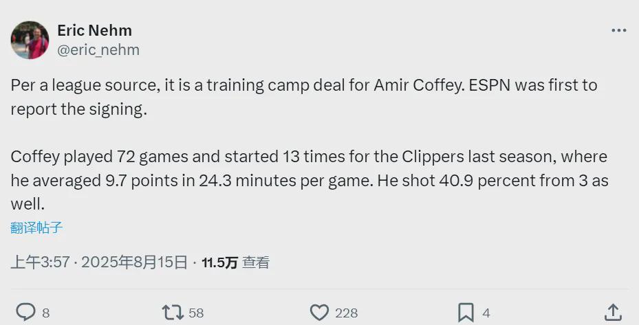 雄鹿随队记者Eric Nehm补充报道,科菲跟雄鹿签下的只是一份训练营合同。快船记者Farbod Esnaashari评价:“虽然科菲被不少快船球迷批评,但他多次在关键时刻挺身而出。”有一说一,雄鹿只给训练营合同,还要什么自行车?